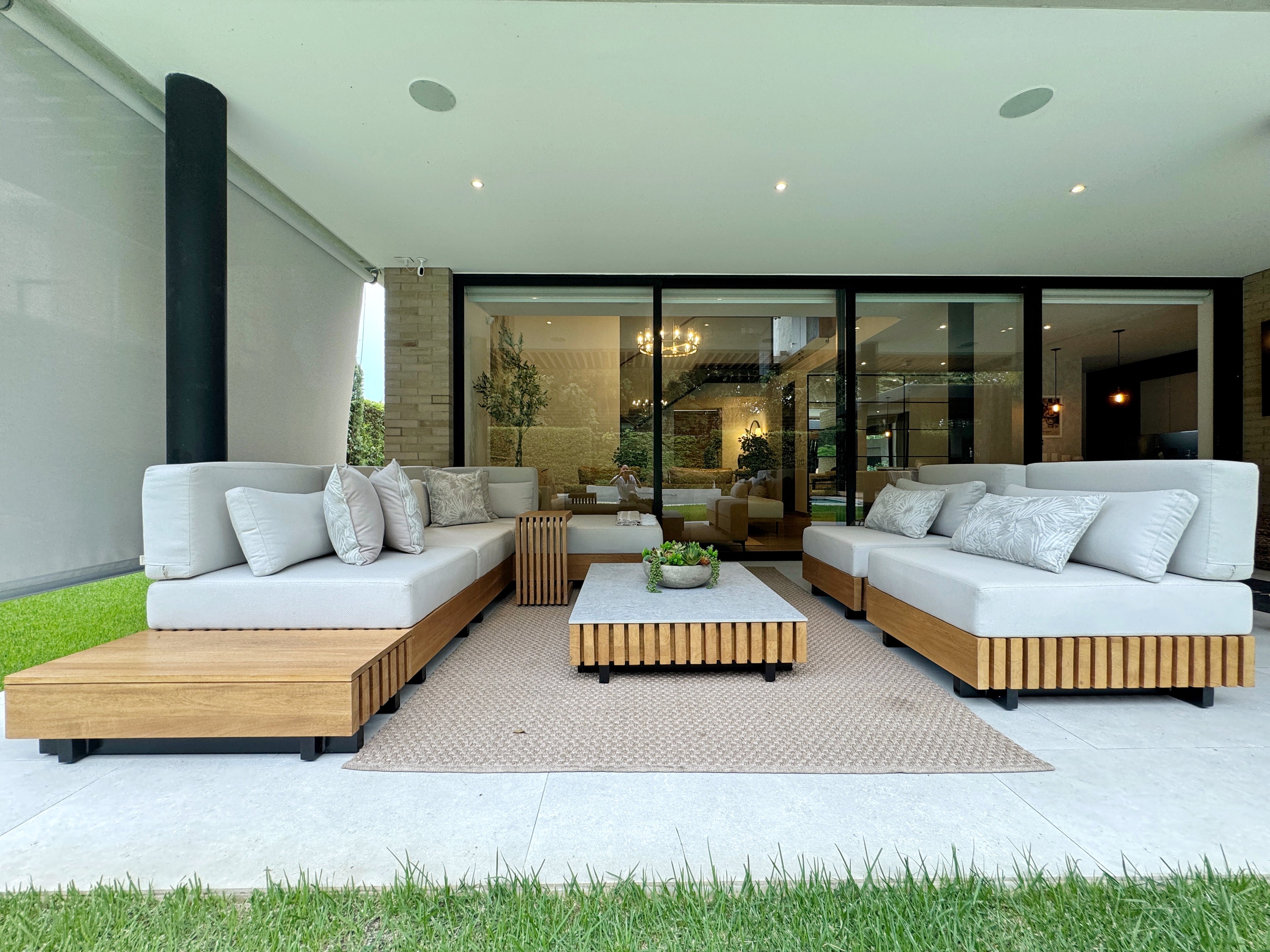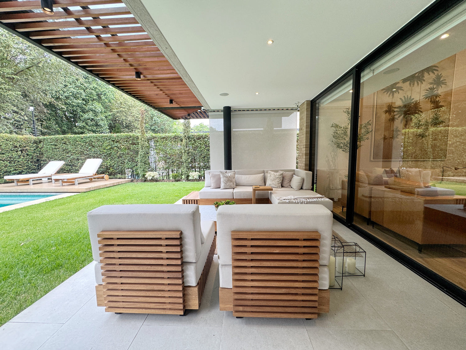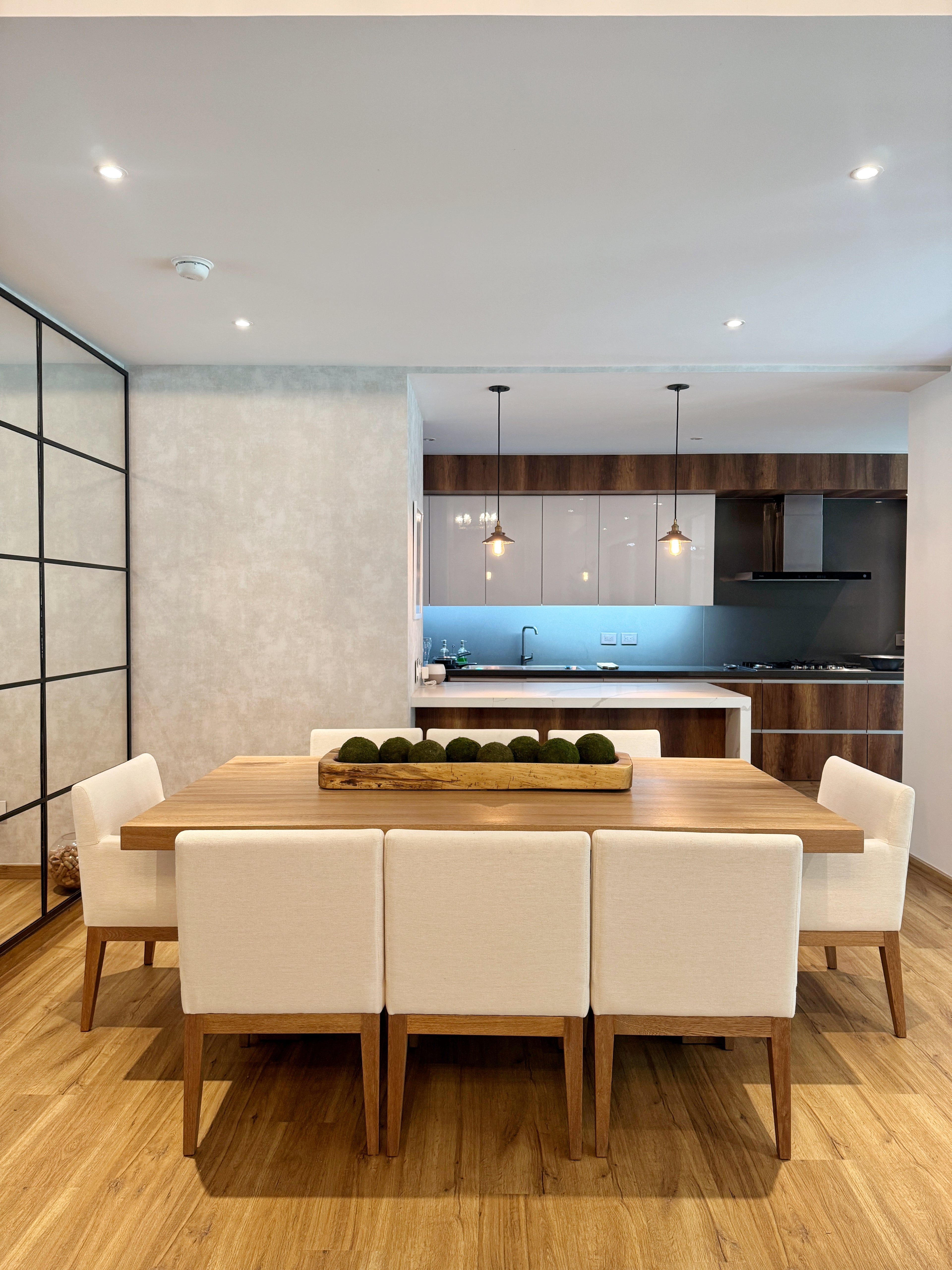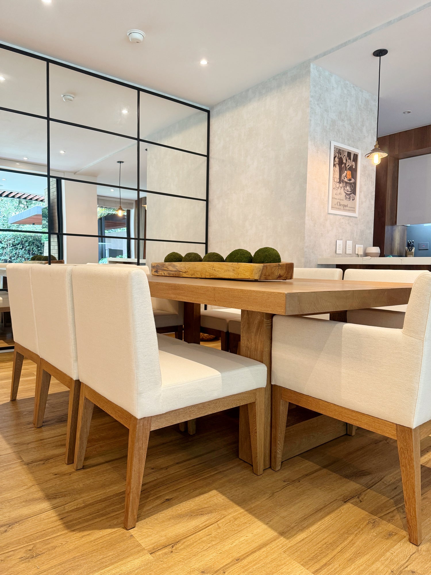 Diseñamos un espacio con un espejo grande en hierro que nos permitio generar amplitud y lo complementamos con un comedor de 8 puestos elaborado en madera maciza de flor morado natural y tapiceria en lino blanco.