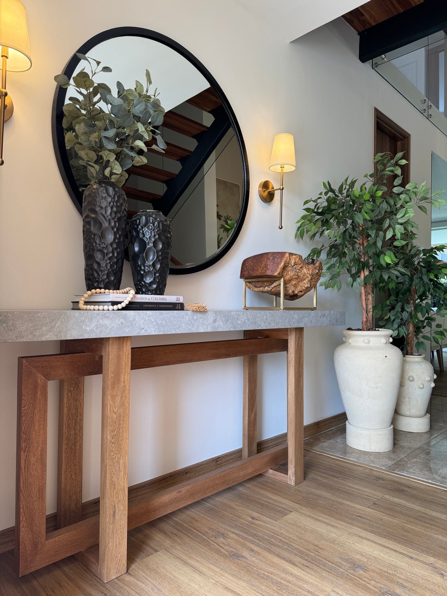 Para este espacio escogimos una consola hecha en madera flor morado natural con una superficie en piedra sinterizada en color gris que nos permite hacer un contraste de colores acogedor y lleno de diseño.