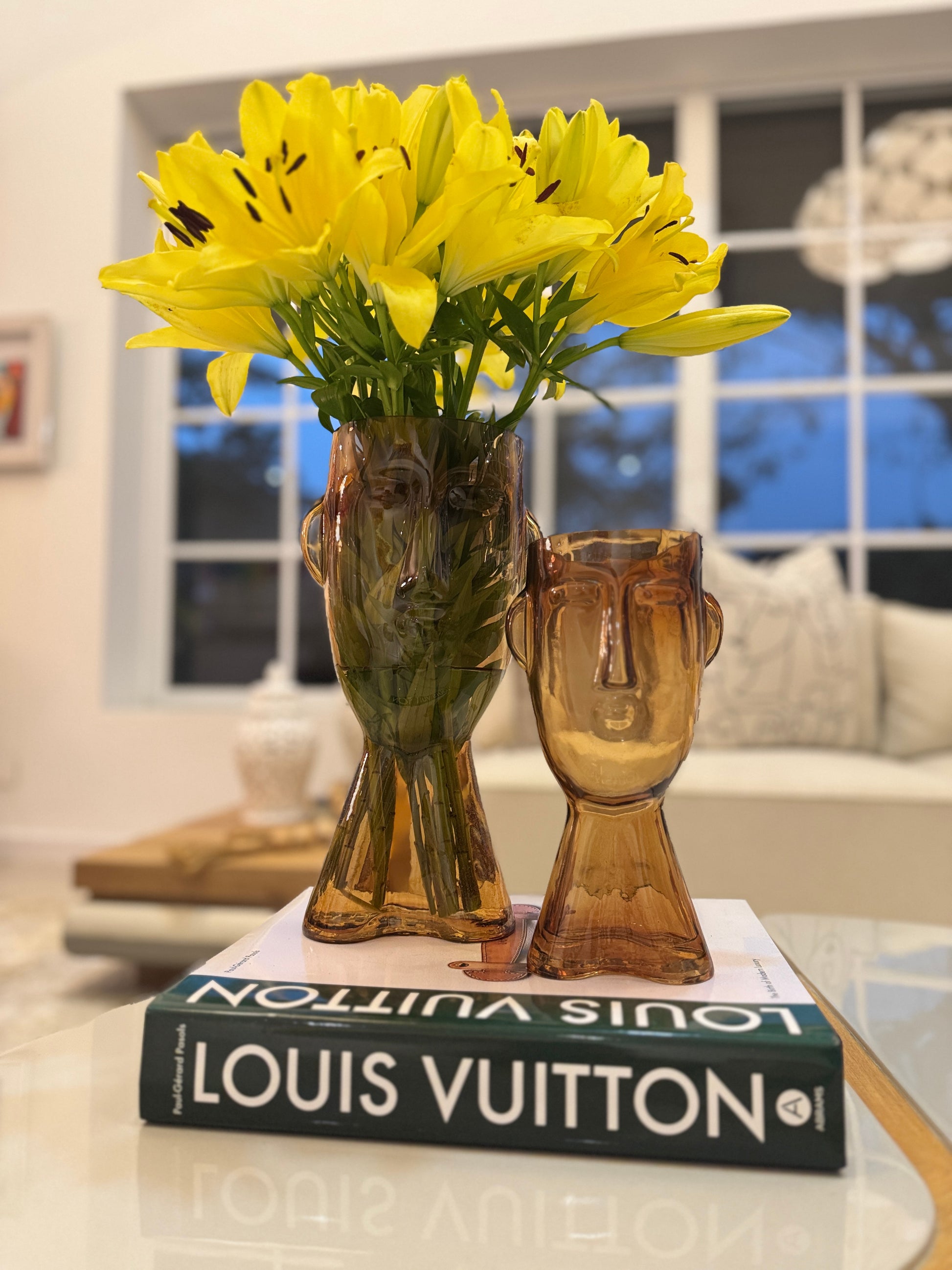 - Jarrones con forma de caras en cristal color ámbar.