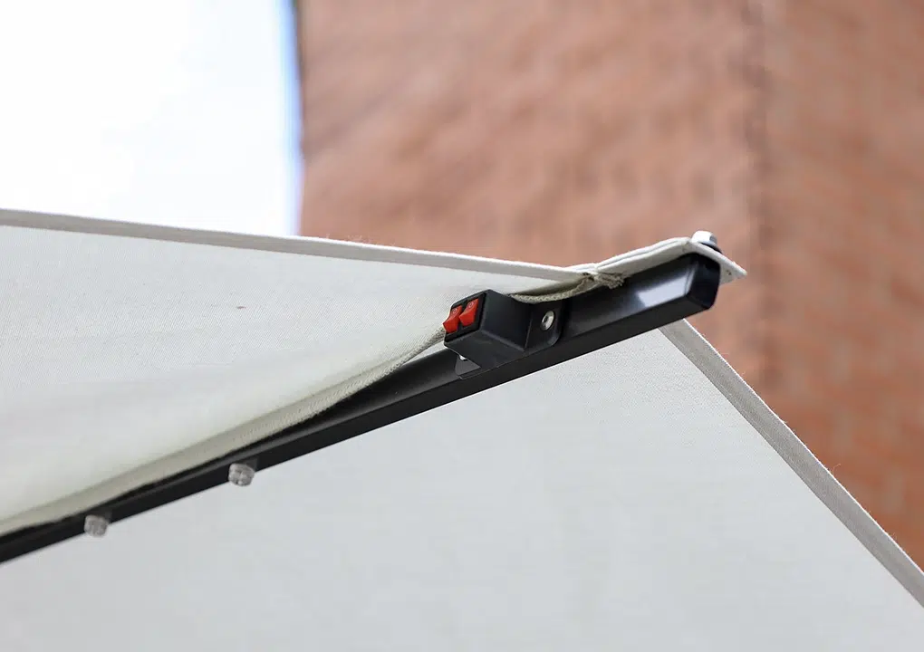 - Botón que permite inclinar la parte superior de la sombrilla (hasta 30 grados) hacia la derecha o izquierda para mejorar el control solar y función para rotar la parte superior 360 grados.